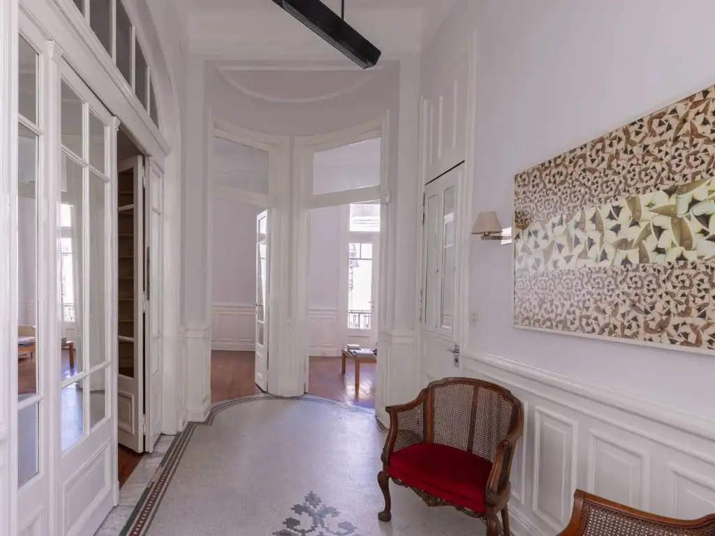 Distinguida oficina en alquiler en Recoleta/Retiro. Edificio estilo Francés. En esquina. Planta dividida en excelente estado. Recién pintada. Amplia recepción. 2 despachos al frente. Techos altos. Piso de pinotea. Buena luminosidad. Sala de reuniones. 3 despachos centrales. 1 baño completo. Cocina grande. Área de trabajo al contrafrente. altillo para depósito. Aire Acondicionado central frio calor propio.