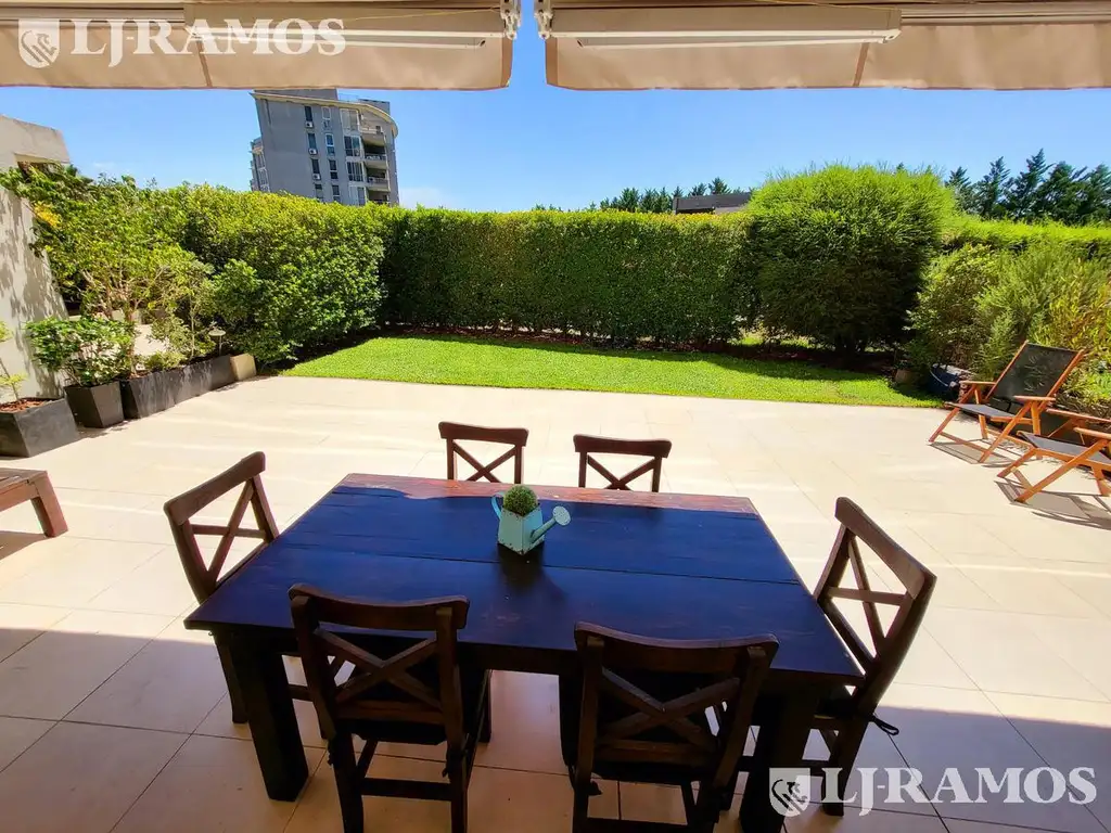 Espectacular departamento de 3 ambientes en planta baja con galería, parrilla y jardín propio. Amplio living comedor con cocina integrada. Dormitorio principal en suite con vestidor. Un segundo dormitorio con un cómodo placard y otro baño completo, y salida al jardín por amplios ventanales. Jardín de 90 m2 con gran cerco vivo, tiene una espaciosa galería con parrilla, barra y toldos italianos con brazos extensibles que permiten ampliar aún más el espacio de sombra (orientación NE). Cochera fija. Todos los ambientes cuentan con aire acondicionado frío/calor y calefacción por piso radiante.