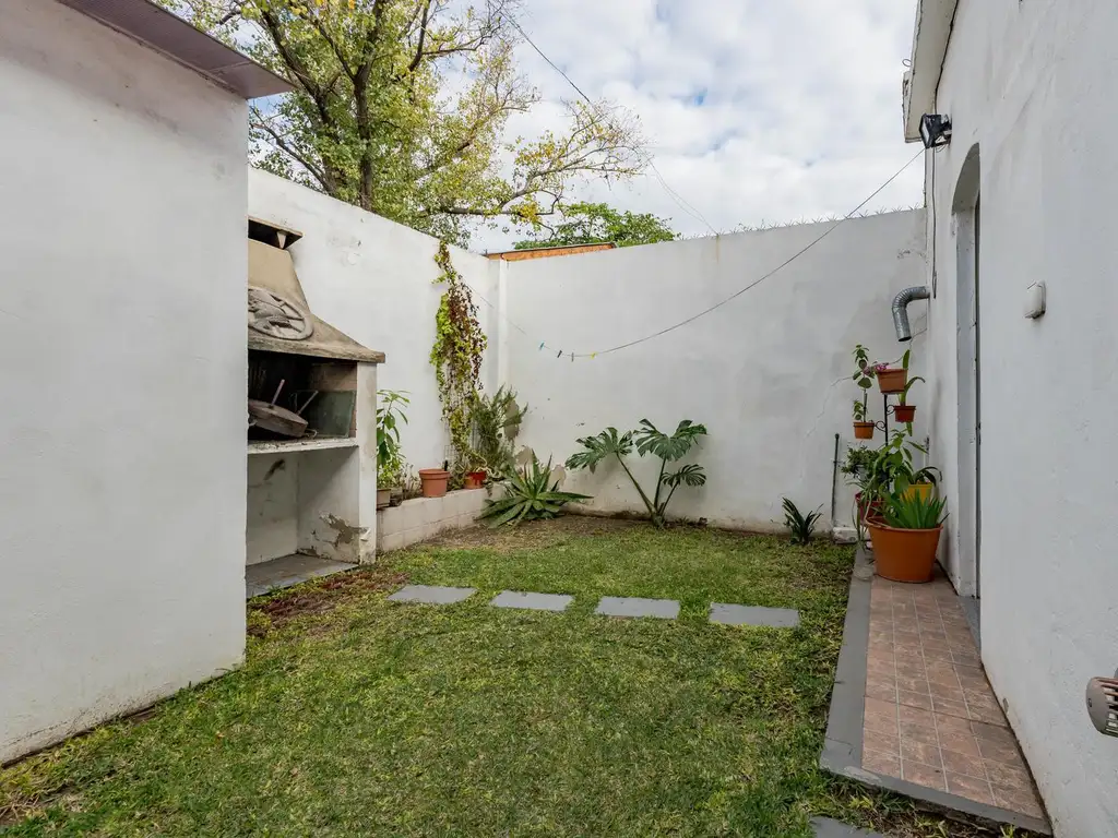 Jardín con espacio verde y parrilla. Cuarto de guardado con lavadero. Cochera con portón que se puede automatizar.