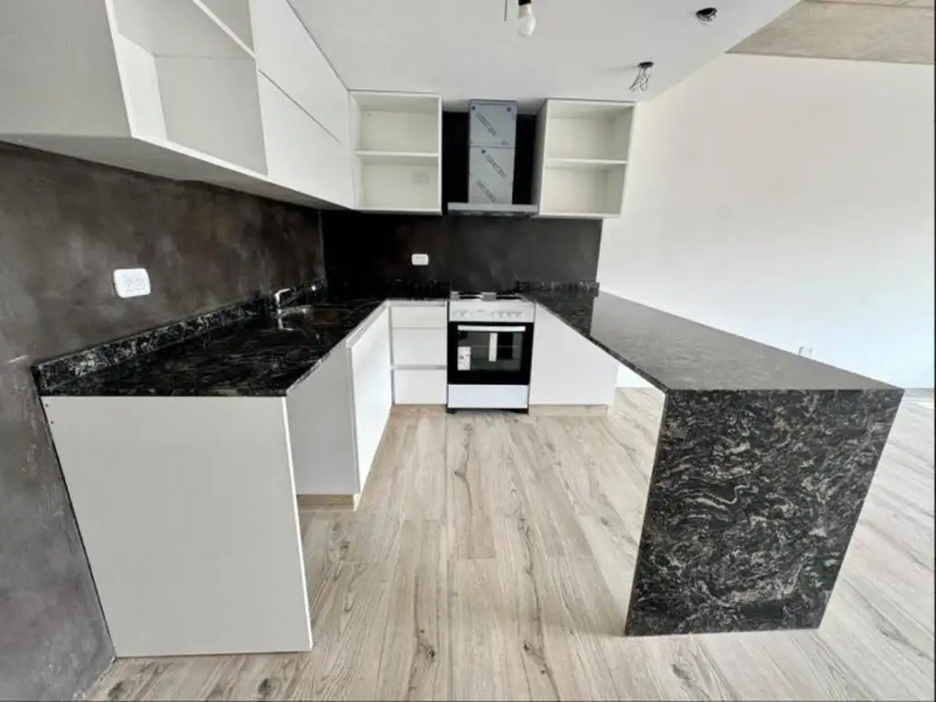 Cocina integrada equipada con bajo mesada, barra desayunador, cocina eléctrica y pre-instalación para campana extractora.