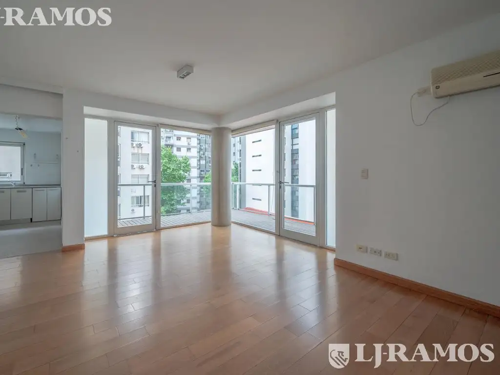 Tres ambientes con cochera fija. Excelente luminosidad. Living comedor con gran ventanal con salida a un amplio balcón en L con DECK. Vista abierta al jardín de la torre. Dos (2) dormitorios, principal en SUITE con vestidor. Segundo dormitorio con amplio placard y segundo baño. Moderna cocina con espacio para LAVARROPAS Y LAVAVAJILLAS. (Puertas corredizas que dividen la recepción de la cocina). Lavadero incorporado. El departamento ofrece una excelente planta, y distribución. Servicios individuales. (Losa radiante individual y agua caliente ind. por caldera).
