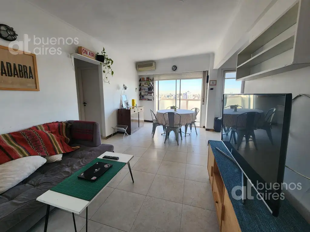 Amplio living-comedor con cómodo sillón, TV LED, juego de mesa y sillas y aire acondicionado.