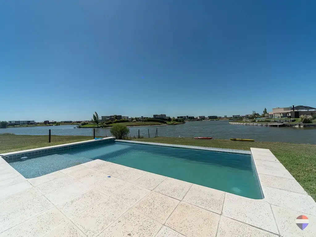 Desde el ingreso nos recibe un amplio living comedor con grandes ventanales, que permiten una conexión directa con el exterior y generan una vista privilegiada hacia el jardín, la pileta y la laguna.
