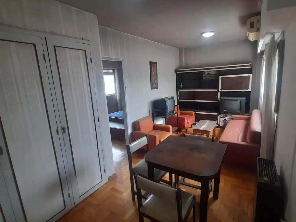 Se encuentra de época empapelado, pisos de parquet en toda la unidad bien mantenidos, aire frio- calor en living, heladera con frezzer, sillones, mesa y 4 sillas, el mobiliario es a reciclar o puede servir para reacondicionarlo para ponerlo en alquiler, el edifico acepta contratos de alquiler temporal, apto profesional y vivienda.