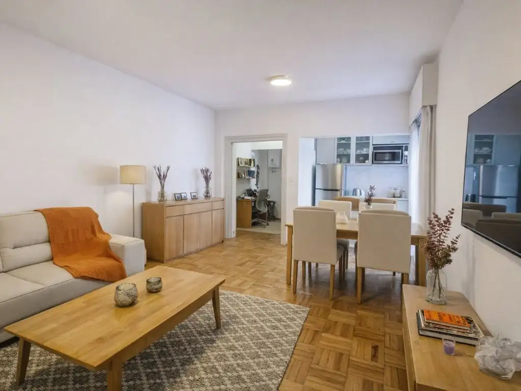 El departamento conserva detalles originales de valor como el parquet pulido y plastificado, e incorpora mejoras en instalaciones eléctricas y servicios.