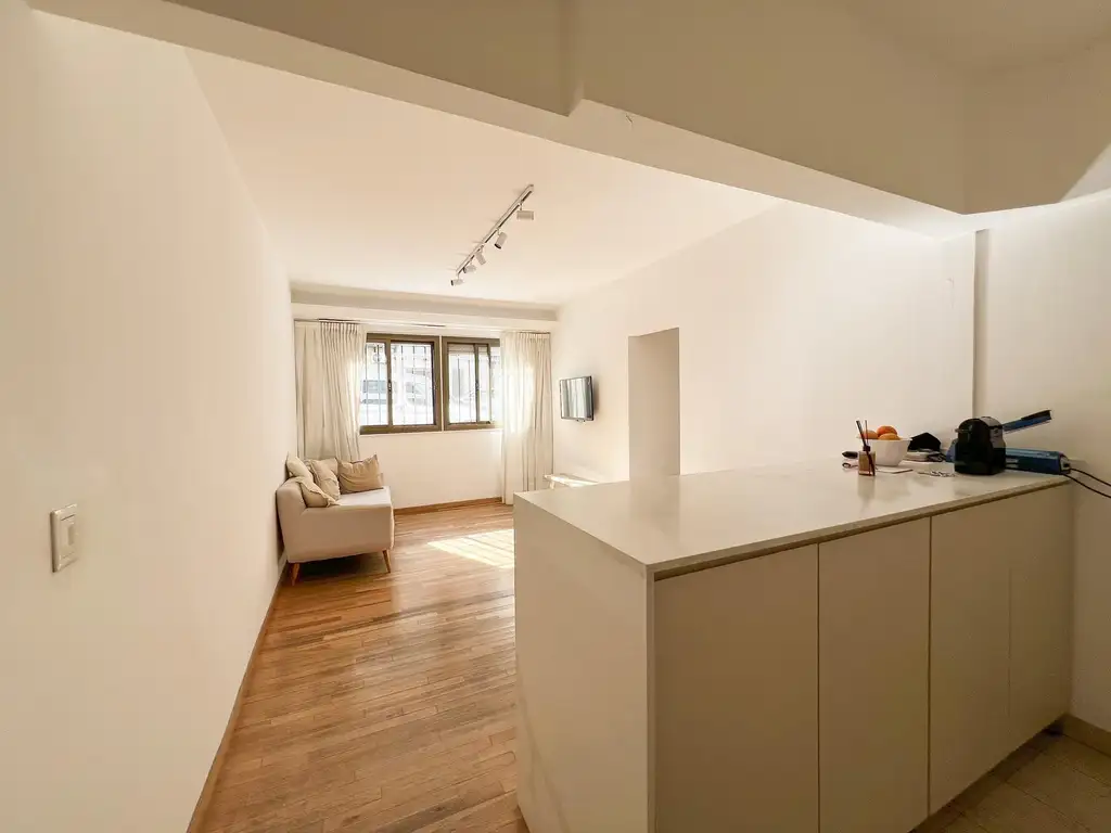 El departamento cuenta con un amplio living comedor que se integra armoniosamente con la cocina, creando un espacio abierto y funcional. Dispone de dos baños completos, renovados con materiales de calidad. El dormitorio principal en suite incluye un vestidor, proporcionando un espacio privado y confortable. El segundo dormitorio tiene acceso directo a un patio techado que actualmente se utiliza como lavadero, ofreciendo versatilidad y practicidad.