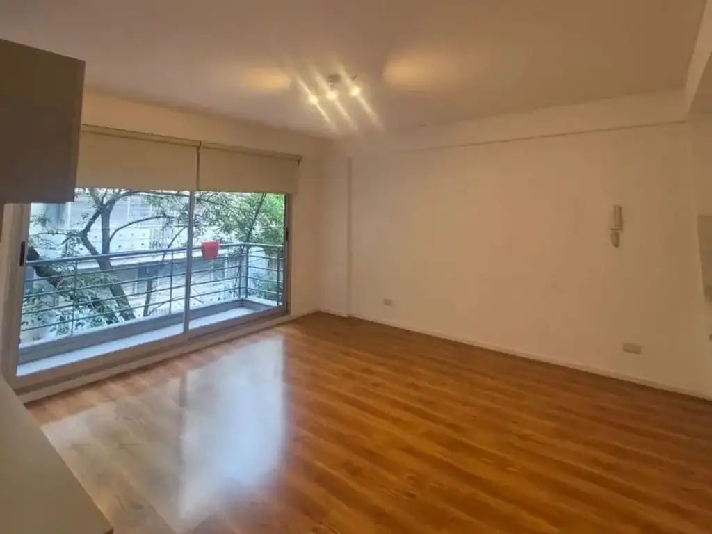 DETALLES: Dispone de un dormitorio, living comedor, distribuidor y baño, con espacios bien definidos y funcionales. Living comedor y baño con aire acondicionado. El área principal integra la cocina, equipada con muebles bajo mesada y alacenas hasta el techo, junto al living-comedor, ambos con pisos flotantes de acabado uniforme. El dormitorio presenta placares con puertas corredizas, cajoneras, bauleras y estantes, además de un ventanal que da acceso al balcón, el cual ofrece vista a la calle y permite la entrada de luz natural. El baño está equipado con sanitarios completos, bañera, extractor de aire, luminarias y muebles de almacenamiento.
