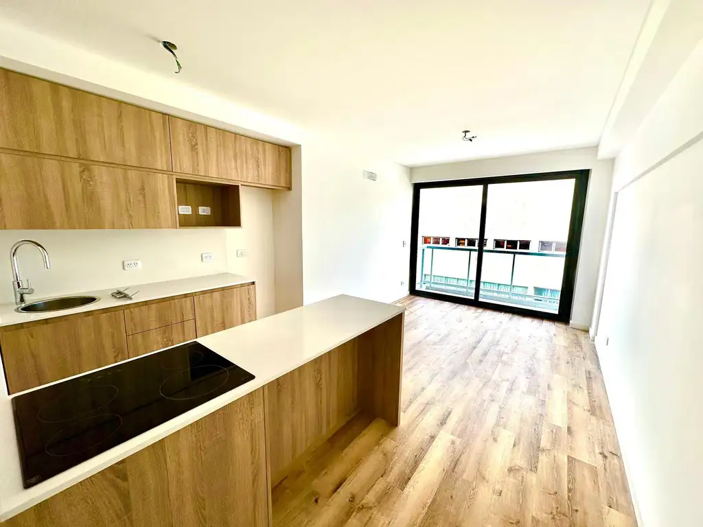 El interior destaca por su piso vinílico símil madera de alta durabilidad y bajo mantenimiento. Las aberturas cuentan con DVH (doble vidrio hermético), proporcionando aislamiento térmico y acústico. El baño es completo, con bañera y sanitarios de primera línea. La cocina integrada está equipada con una barra desayunadora, anafe y horno eléctrico digital, además de una bacha de acero inoxidable y conexión para lavarropas.
