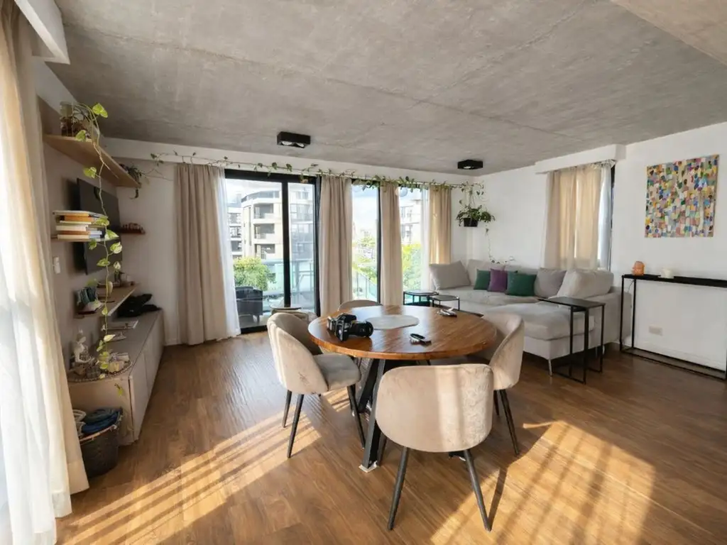 El inmueble presenta un diseño contemporáneo con orientación norte, destacándose por su luminosidad y distribución eficiente. El living comedor integrado cuenta con salida a balcón, pisos símil madera y techo de hormigón visto que aportan un estilo industrial elegante. La cocina, totalmente equipada, incluye muebles en tonos oscuros y barra desayunadora con excelente espacio de guardado.