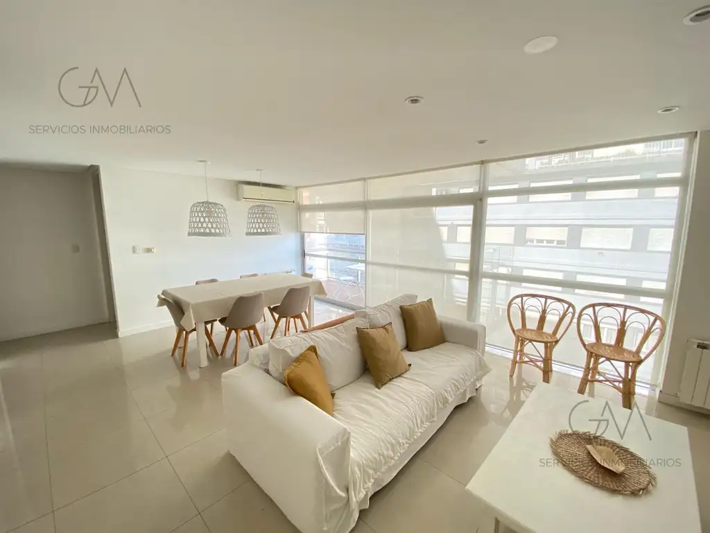 Living comedor: mesa para 6 personas, sillón 3 cuerpos y TV. Balcón con vista lateral al mar y parque San Martín. Aire acondicionado.