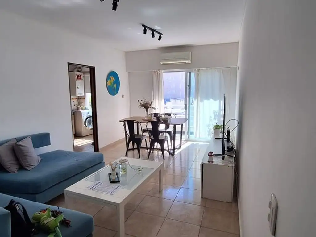 El living permite el acceso directo al balcón, generando una conexión natural con el exterior y amplificando la sensación de espacialidad. La cocina, integrada al comedor, presenta muebles completos en excelente estado, optimizando la funcionalidad del espacio.