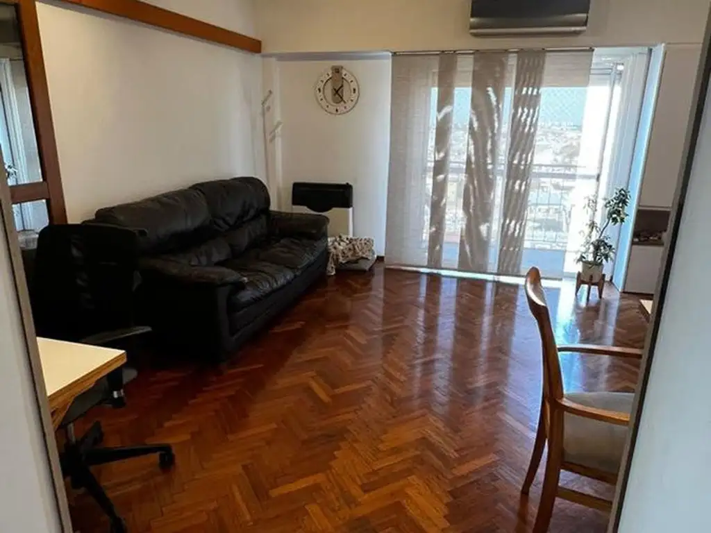 Por la puerta principal ingresamos a un living comedor de amplias dimensiones, con pisos de madera y salida al balcón al frente de calle.