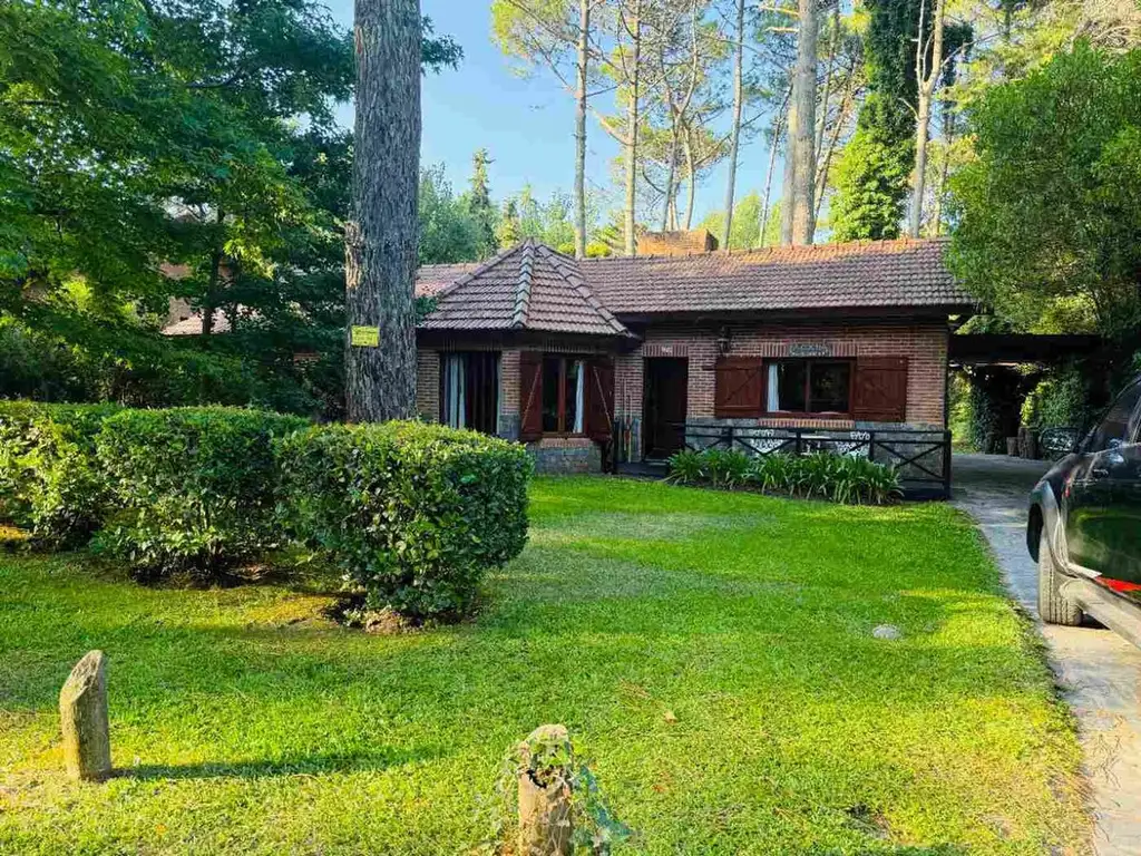Casa en venta en Cariló de 5 ambientes con gas natural. Propiedad con frente de ladrillo visto, piedra y postigos de madera, ubicada en una calle tranquila, rodeada de bosque y en un entorno boscoso.