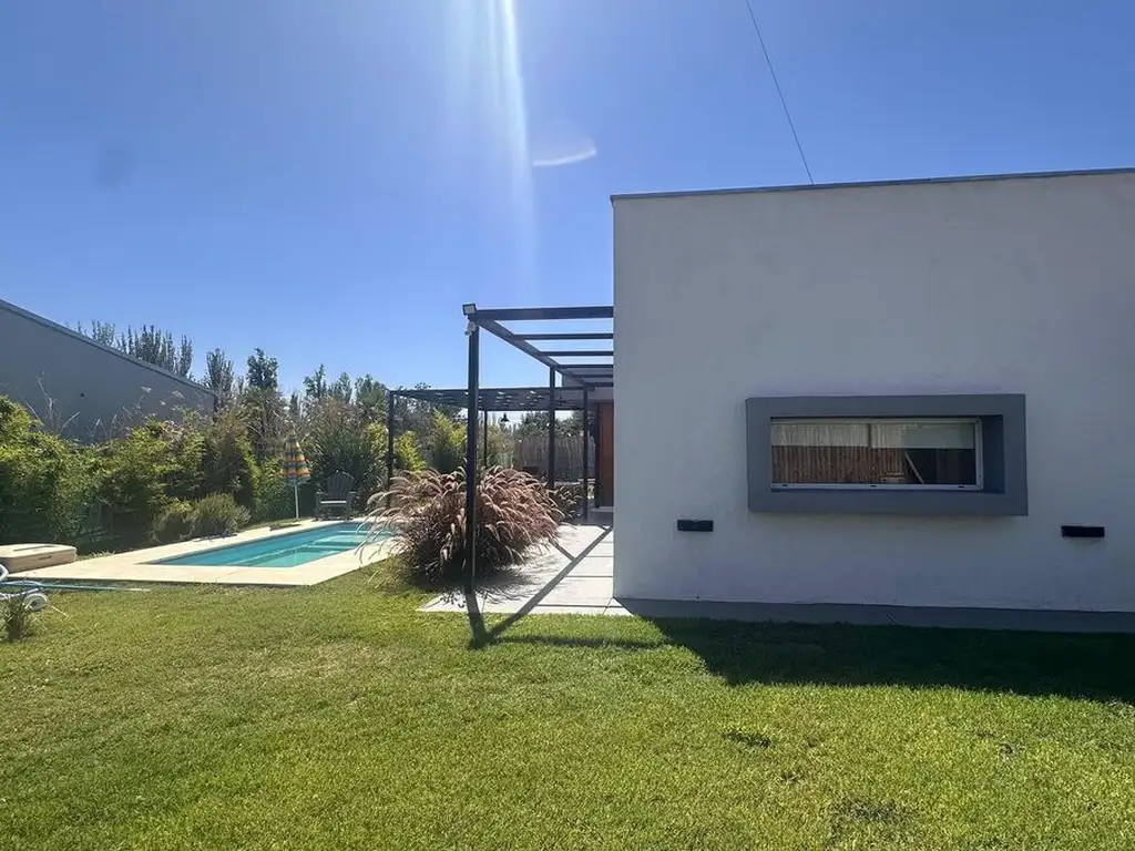 El inmueble dispone de dos dormitorios, un baño completo (con ante baño), y un amplio ambiente integrado de cocina, comedor y estar, con salida directa a la pérgola de madera, al patio parquizado y a la piscina recientemente instalada y cochera para un vehículo.