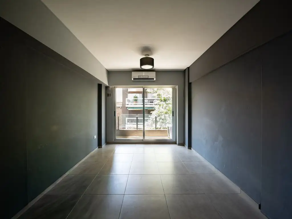 El dormitorio, equipado con placard, se ubica al contrafrente con segundo balcón privado, asegurando circulación de aire y privacidad. Características destacadas incluyen cocina completa, baño equipado, espacio para lavarropas y dos equipos de aire acondicionado instalados.