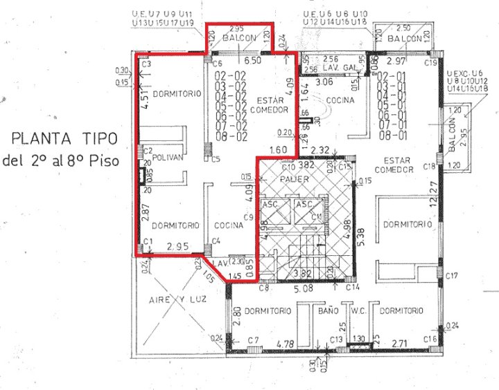 Ingreso al living comedor (3,67 m x 4,04 m) con piso parquet y salida al balcón (1,20 m x 2,95 m). Cocina (2,07 m x 2,94 m) con salida al lavadero. Baño (1,60 m x 1,56 m). Dormitorios al frente (2,82 m x 2,96 m) con placard. Dormitorio al contrafrente (2,89 m x 2,81 m). Ambos dormitorios poseen piso parquet.
