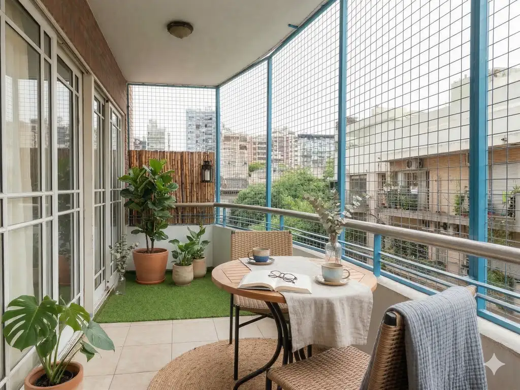 El balcón al frente permite armar una mesa o un juego de living exterior; hoy tiene red de protección y una parrilla móvil.