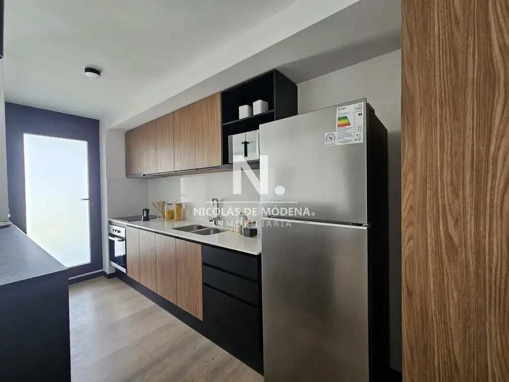 Cuenta con un amplio living comedor con terraza, cocina definida con equipamiento completo (horno eléctrico, anafe y campana extractora), muebles aéreos y bajo mesada, además de aire acondicionado instalado en living y dormitorios.