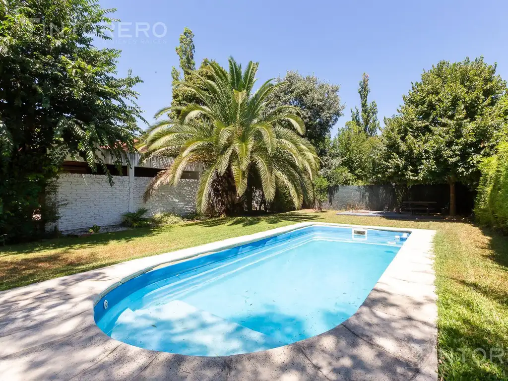 Saliendo al exterior, la casa muestra uno de sus mayores diferenciales: un gran jardín con pileta, rodeado de árboles, que invita a disfrutar del aire libre todo el año. El quincho con parrilla y ventiladores permite organizar encuentros sin depender del clima, mientras que el fogonero al fondo suma un espacio especial para reuniones al atardecer o noches al aire libre.
