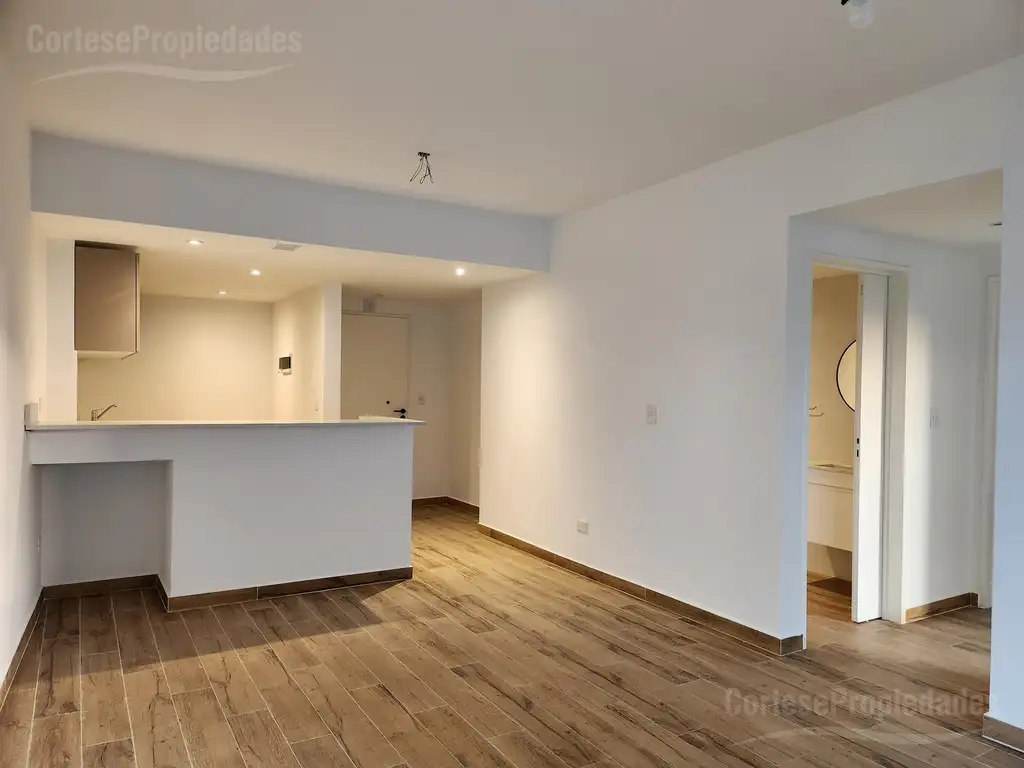 3 ambientes en esquina con balcón aterrazado, dos dormitorios al frente, dos baños completos, Cocina abierta al living comedor, Pisos de porcelanato símil madera, preinstalación para aires acondicionados, agua caliente central.