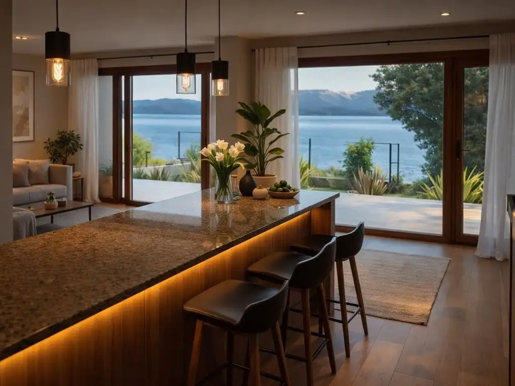 La luminosidad y la conexión con el entorno son protagonistas en cada ambiente gracias a los amplios ventanales piso-techo y a la orientación norte del edificio, que garantiza una excelente entrada de sol durante todo el día, mejorando notablemente la eficiencia térmica y el confort. Desde prácticamente cualquier punto del departamento se disfruta de una vista espectacular de 180° al lago Nahuel Huapi, con acceso directo y exclusivo a la playa privada del complejo.