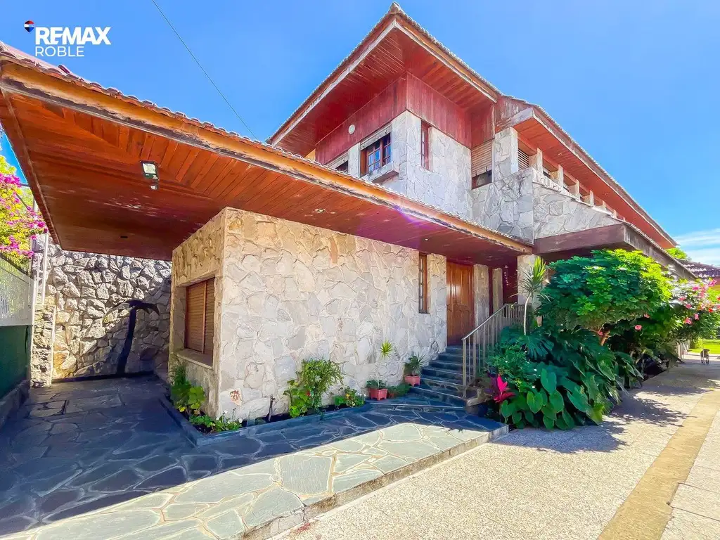 En excelente estado, la casa cuenta con 275 m2 cubiertos dispuestos en dos plantas. En planta bala accedemos a un amplio living con pequeña barra para servir tragos, ventanas tipo Barrio en todo el lateral, y yendo mas hacia el interior de la propiedad se encuentra el comedor semi integrado a la cocina conectados por una gran barra desayunadora, con mueble sobre y bajomesada de madera. Luego nos encontramos con un quincho integrado a la casa con baño y lavadero. Desde el mismo se tiene una hermosa y amplia vista al parque.