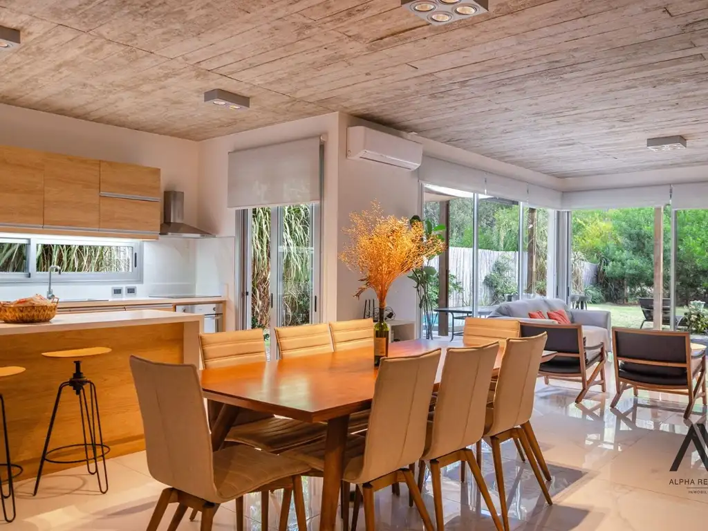 El área social se compone de un amplio living comedor con estufa a leña, creando un ambiente cálido y acogedor, perfecto para disfrutar durante todo el año. La cocina moderna y de generosas dimensiones se integra de manera funcional al resto de la casa, complementada por una zona de lavadero independiente que aporta practicidad al día a día.