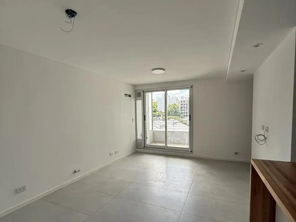 Al ingresar se encuentra un amplio living-cocina comedor con salida al balcón. La cocina está integrada y equipada con muebles bajo mesada y alacenas, cocina con horno, mesada de granito y barra desayunadora que separa el ambiente.