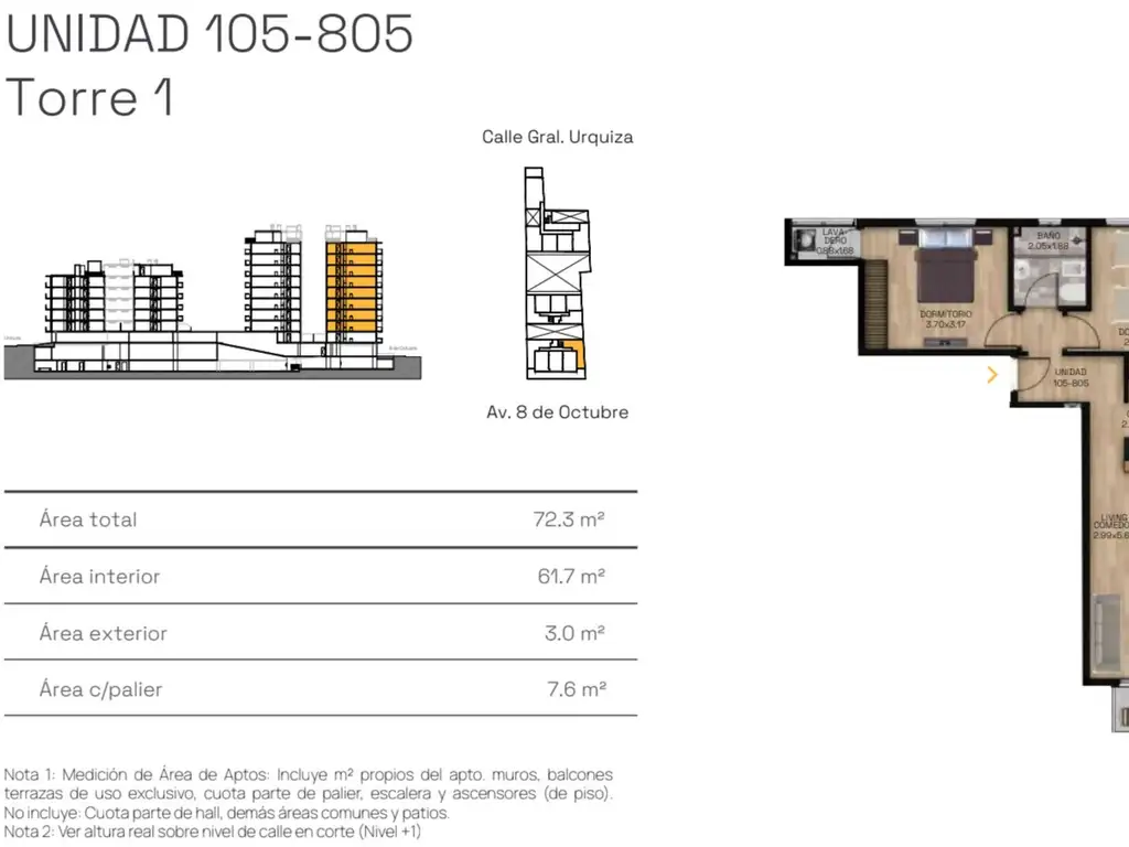 La unidad en venta esta ubicada el primer piso, consta de dos dormitorios, un baño y cocina integrada. Cuenta con balcón al frente que da a 8 de octubre y terraza lavadero.