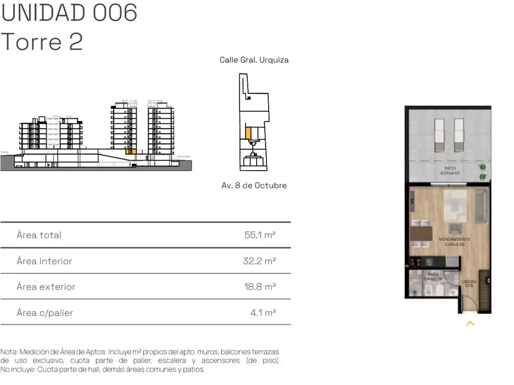 La unidad en venta es un monoambiente con patio. Da a la calle Urquiza, aunque desde la unidad no se ve la calle ya que la unidad queda entre los dos bloques.