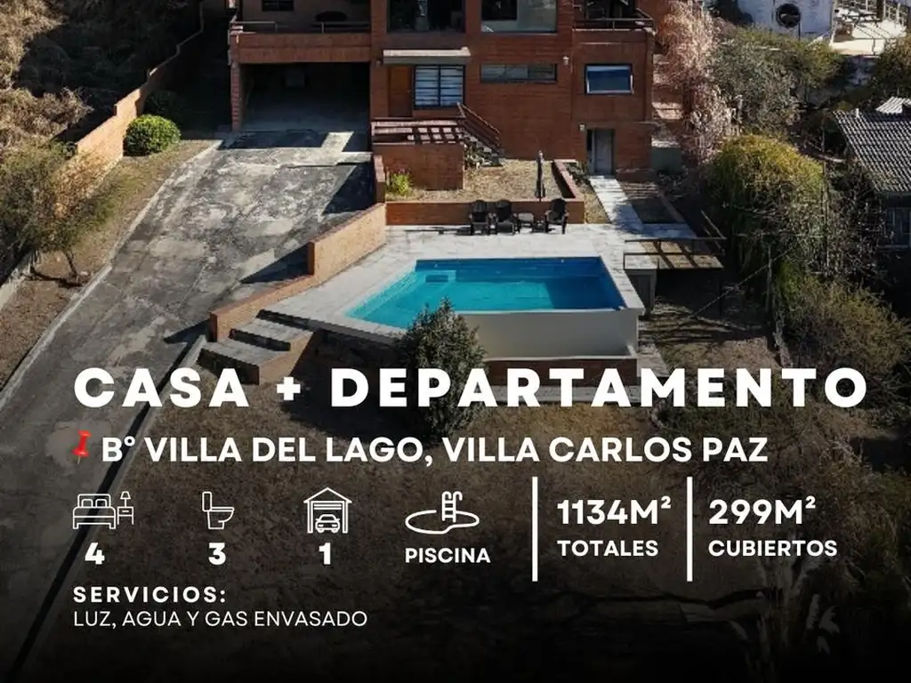 Se vende casa de categoría con departamento, ubicada en zona residencial de Villa Carlos Paz, B Villa del Lago a 8 cuadras del Cucú. Hermosa vista panorámica en un excelente y tranquilo entorno. Tiene acceso desde dos calles. Ambas sin salida. Desde una de las calles ingresa por un jardín a la casa principal.