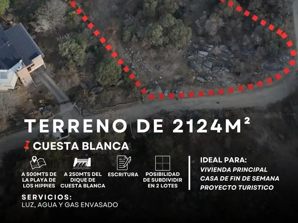 Ubicado a tan solo 250 m del Diquecito de Cuesta Blanca y 500 m de la Playa de los Hippies, este terreno es ideal para quienes buscan construir su vivienda principal, casa de fin de semana o incluso un proyecto turístico.