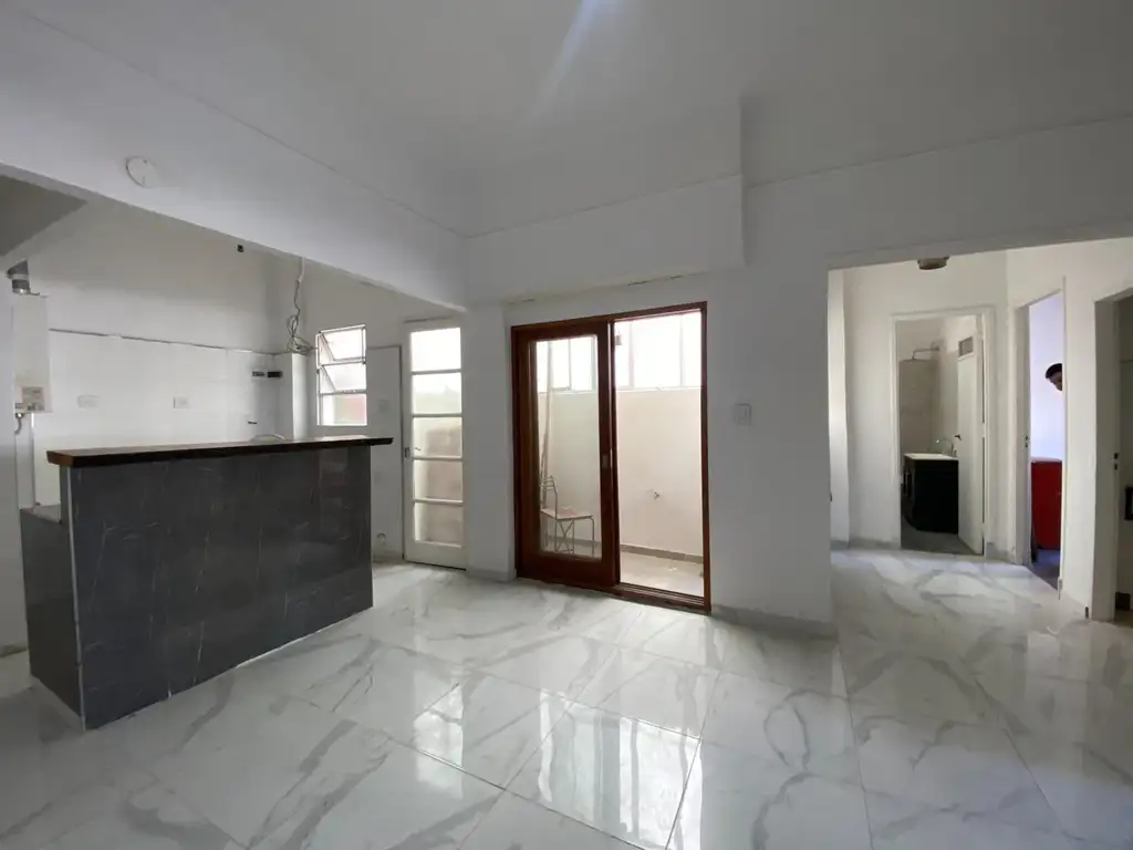 El departamento se destaca por su living-comedor con cocina incorporada, completamente renovada, que aporta amplitud y una dinámica moderna al espacio principal. Los dos dormitorios son cómodos y luminosos, ideales tanto para vivienda como para home office.