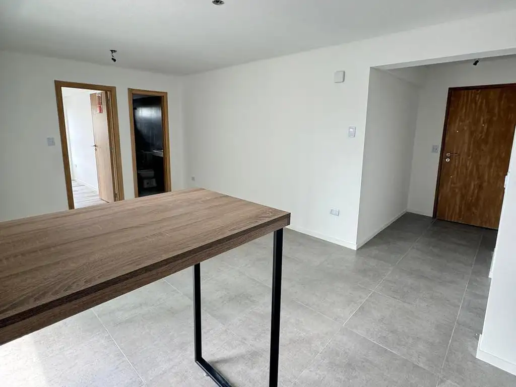 El departamento cuenta con cocina integrada con barra desayunadora, preinstalación para lavarropas, living-comedor, baño completo, dormitorio con placard y balcón.