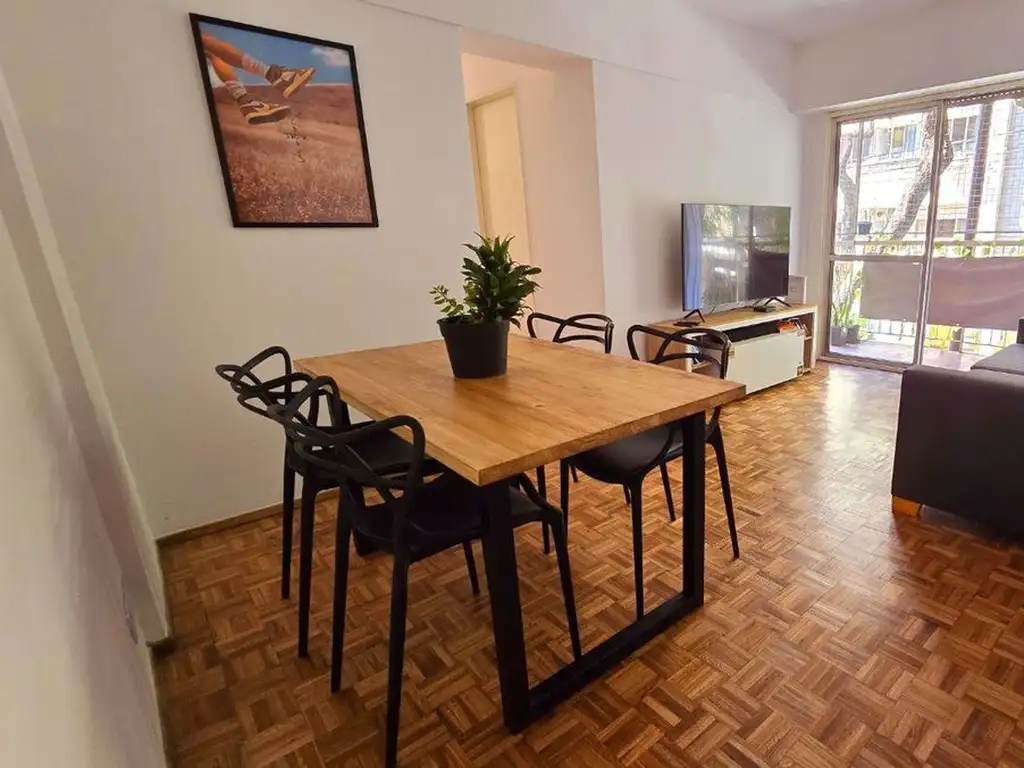 Al ingresar a la propiedad encontramos el living comedor, con un gran ventanal para acceder a un amplio balcón al frente. El piso es de parquet de madera.