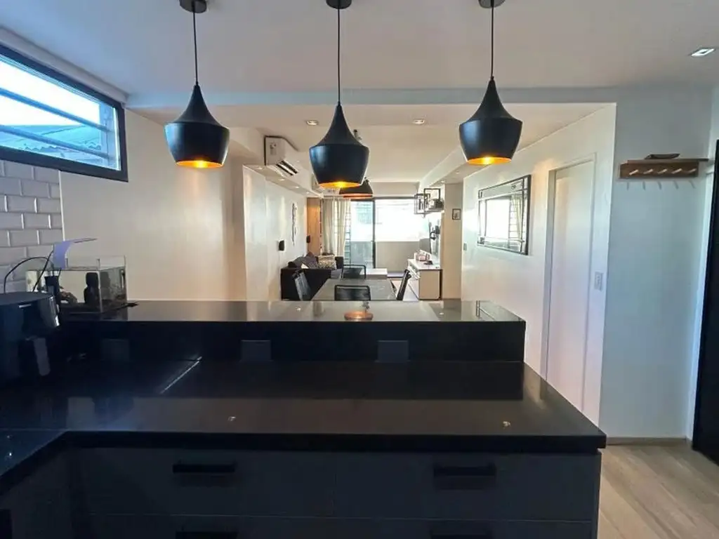 Se accede al departamento por ascensor, ingresando a una moderna cocina con luz natural que ingresa por una ventana. La misma tiene una gran mesada de granito negro y muebles que ofrecen mucho lugar de guardado. Todo el equipamiento de cocina es de gran calidad.