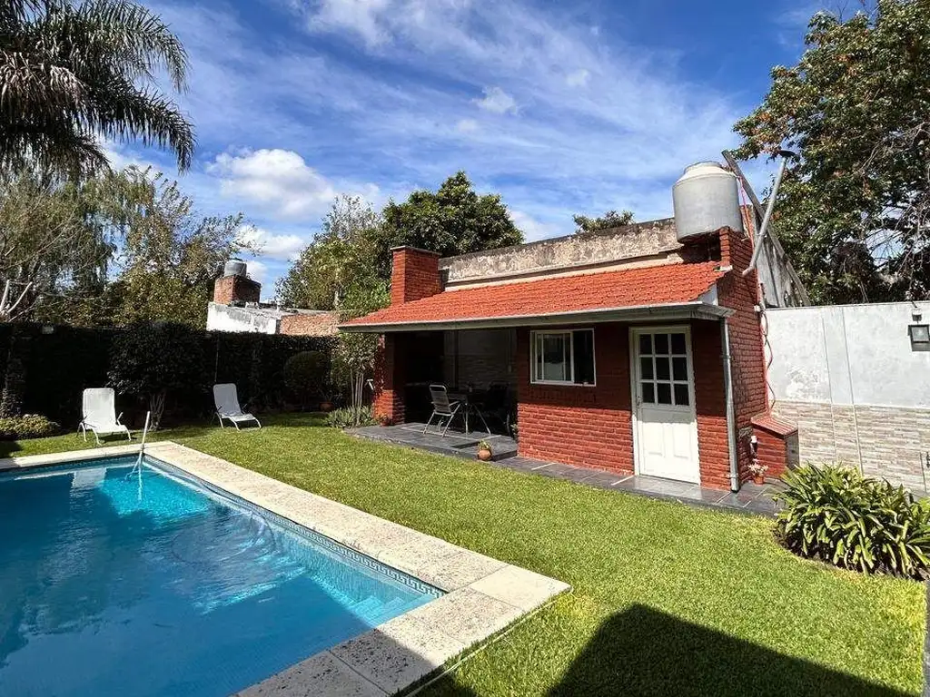 Jardín con piscina de 7m X 3m de hormigón con venecitas (en desnivel, profundidad hasta 1,8m), luces y bomba automática.