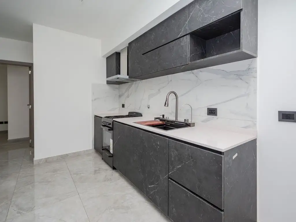 La propiedad despliega sus 60 m² cubiertos con una distribución inteligente que maximiza cada rincón. El living comedor, con su cocina integrada, se transforma en el corazón del hogar, donde la luz natural baña el ambiente. Muebles de cierre suave y terminaciones de primera calidad revelan un cuidado meticuloso en cada detalle.