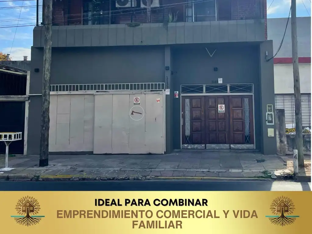Frente de gran presencia con doble acceso, portón para vehículos o carga , puerta independiente al local , comercio, garaje etc.
