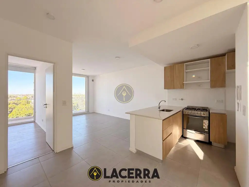 Al ingresar, nos encontramos con la cocina integrada, equipada con muebles bajo mesada en melamina blanca con puertas en tono cedro, y mesada tipo isla en cuarzo blanco, que aporta diseño y funcionalidad. Se conecta con un cómodo living comedor con salida a balcón corrido. El dormitorio dispone de placard empotrado y también salida al balcón. En esta planta se encuentra el baño completo.