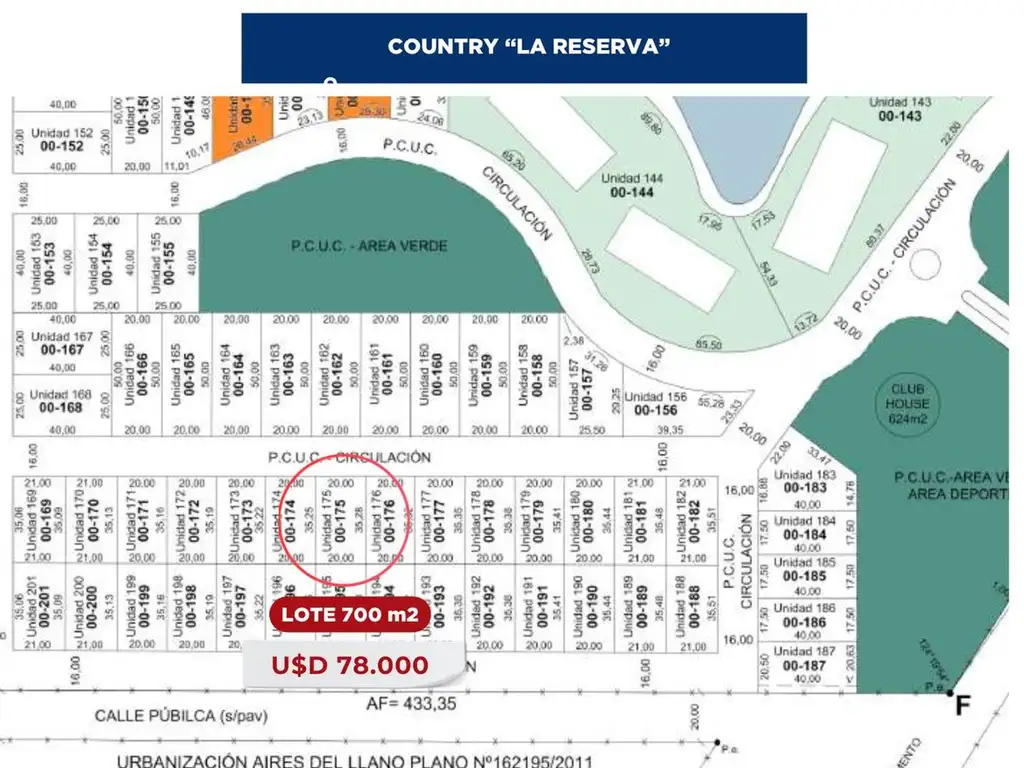 LOTE N°175 A LA VENTA EN LA RESERVA (700 m2)