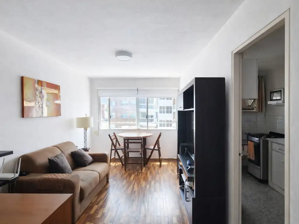El ingreso se realiza por un recibidor funcional que permite incorporar un mueble despojador, conectando directamente con un amplio living comedor. Se destaca el piso de parquet en óptimo estado y una generosa abertura de aluminio que aporta luminosidad al ambiente principal.