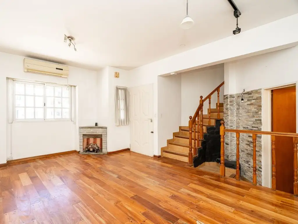 Living-comedor con pisos de madera tarugados, ventanal hacia el frente, conexión para aire acondicionado y hogar a leña con gas.