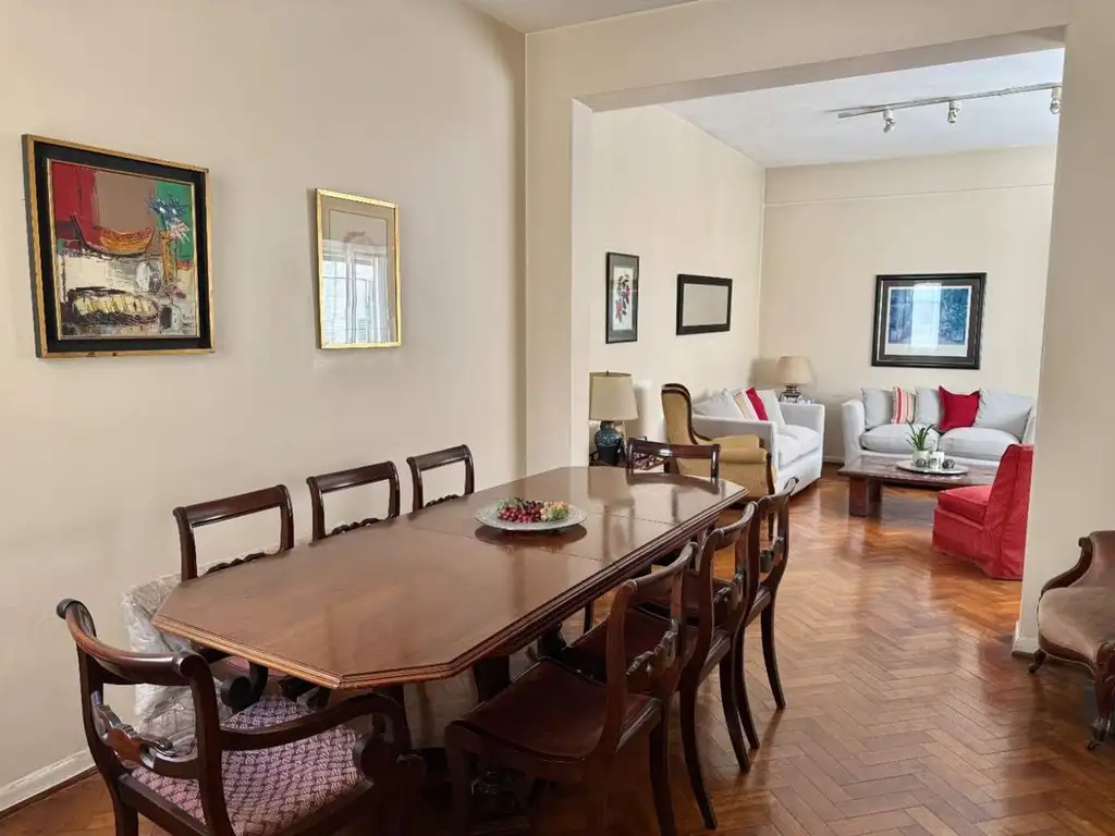 Living comedor de grandes dimensiones con pisos de parquet, al igual que dos de los dormitorios.