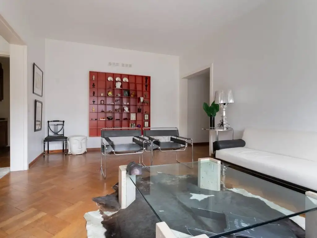 El departamento cuenta con una elegante recepción compuesta por living y comedor con grandes ventanales, lo que garantiza excelente luz natural y vistas abiertas. Los ambientes conservan detalles arquitectónicos originales que reflejan el carácter clásico del edificio, como pisos de madera, molduras de yeso y baños revestidos en mármol, elementos que aportan identidad y jerarquía a la propiedad.