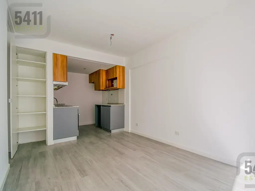 El departamento se distribuye en un living-comedor con salida directa al balcón, generando un espacio cómodo y funcional. La cocina integrada presenta un diseño moderno, con muebles bajo mesada y alacenas de excelente calidad, además de espacio para heladera y lavarropas.
