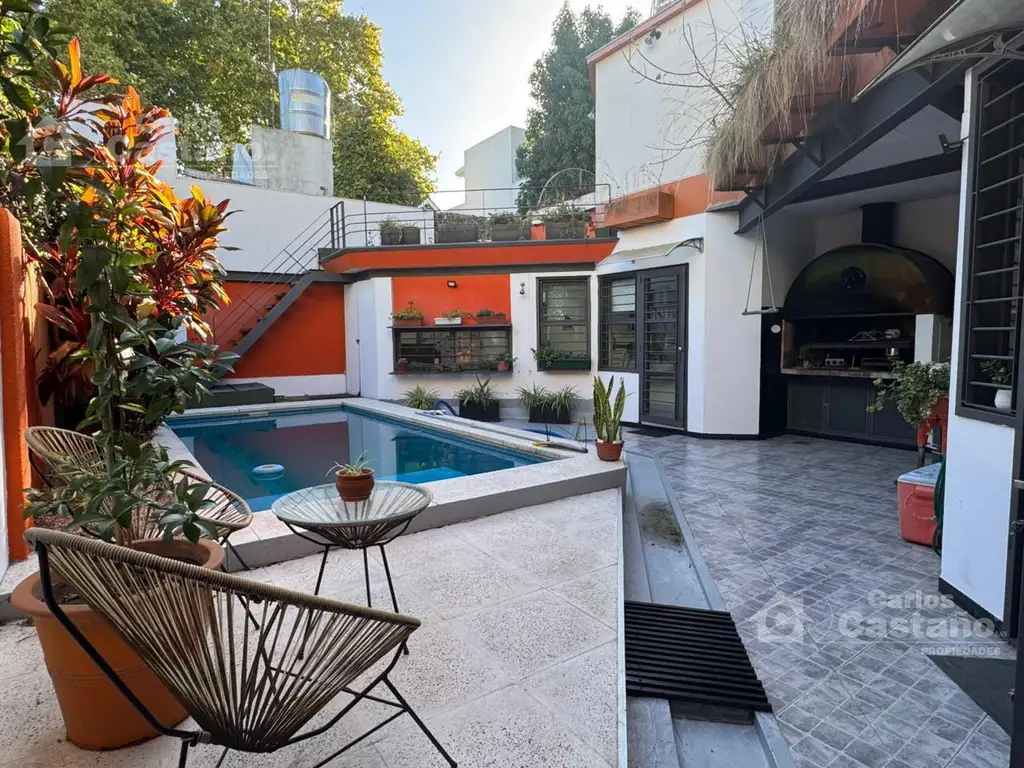 Solida Casa en 2 plantas, 250 m2 cub., sobre Lote de 8,66x25,98m en impecable estado (detalles de categoría), retiro municipal con entrada para 1 auto; Porch; Hall de 3,5x1m; hall doble con altura y claraboya (4,5x4,5m) donde sale la escalera a la PA; Escritorio en PB o cuarto (5o) de 3x3 con entrepiso; amplio Living-Comedor de 8x4m sobre piso de pinotea y ventanas al fondo; Toilette; Cocina octogonal de 4,5x4,5m con Comedor Diario y muebles completos de bajo y alacenas; Lavadero; Fondo de 10x8m con piscina con filtro (5x3m); Quincho de 11m2 con parrilla a gas; Playroom (17m2) o lugar de trabajo.