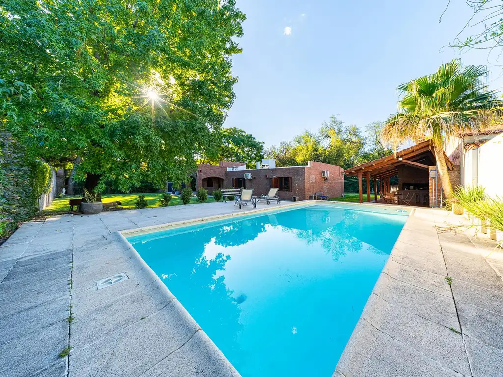 Cuenta con gran jardín parquizado, piscina con solárium y quincho independiente con parrillero, habitación y baño.