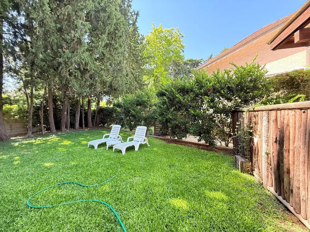 Jardín parquizado con pinos que aportan frescura y encanto natural.