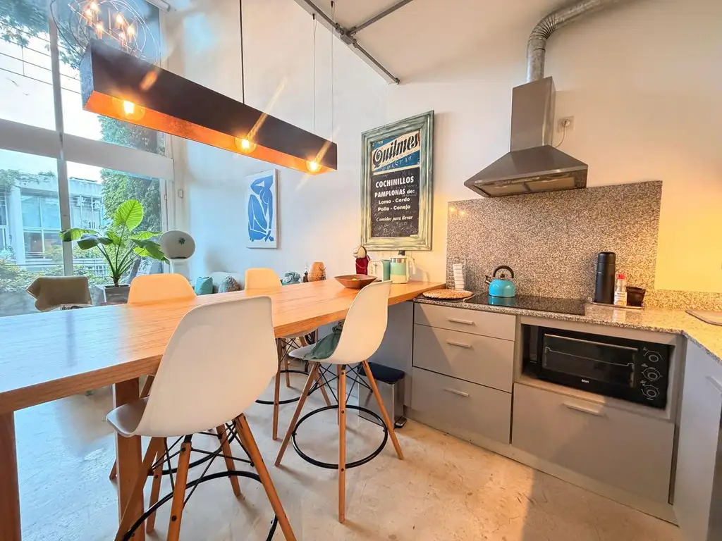 Ambiente principal integrado, con sol de mañana... Cocina separada por una barra de madera ideal para comer y evitar otra mesa en el ambiente, y equipada con muebles bajo mesada optimizando el espacio. Anafe, campana de acero inoxidable y espacio para un horno eléctrico. Toilette con ducha.